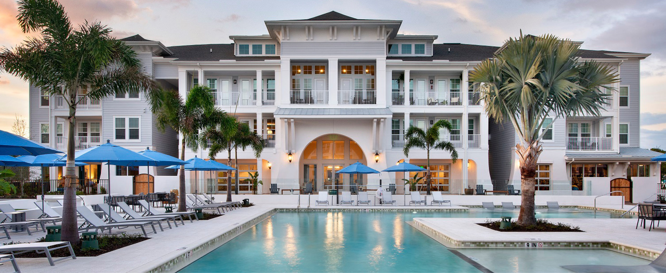 The Tyde is a new construction, Class-A multifamily project located in Panama City Beach, Florida. The project features one-, two-, and three-bedroom apartments within a variety of building types: two-story carriage homes, three-story walkups, and four-story elevator-serviced buildings. The Project is amenitized with an integrated clubhouse and fitness center with interior community space accompanied by a resort-style pool with an outdoor fireplace and grilling stations. The Tyde offers prospective renters a combination of high-end apartment living with a local coastal Florida feel.